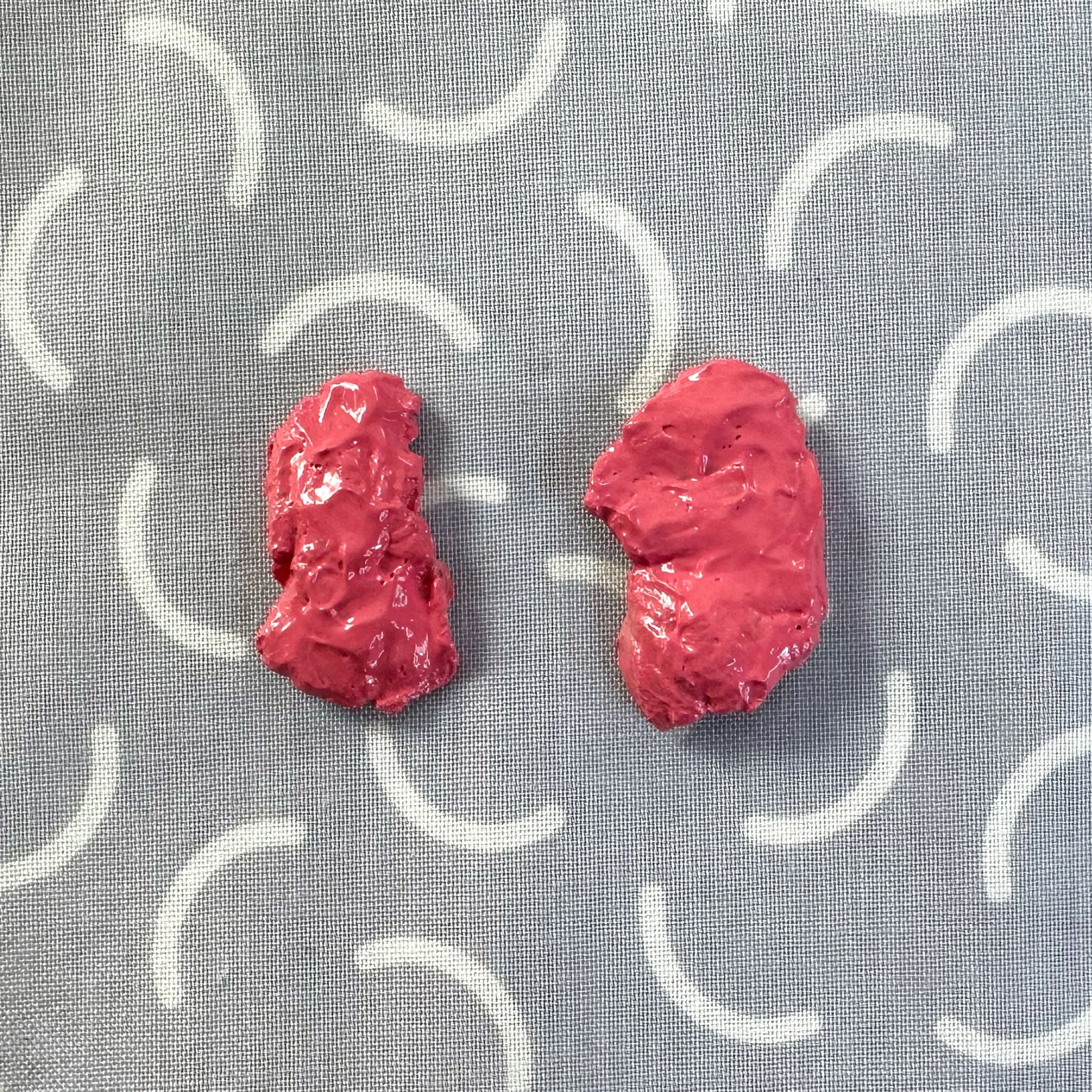 Finally figured out what to do with these little ceramic scrunchles! One of my studio-mates (shout out to Jess!) was trimming some pieces ages ago, and I loved how the bits looked so I kept them, glazed them, and fired them. They’re porcelain, but have a chewed gum look, so I did a rough daub with some pink acrylic paint and they came to life — like they were scraped off the sidewalk and stuck right on as an accessory.