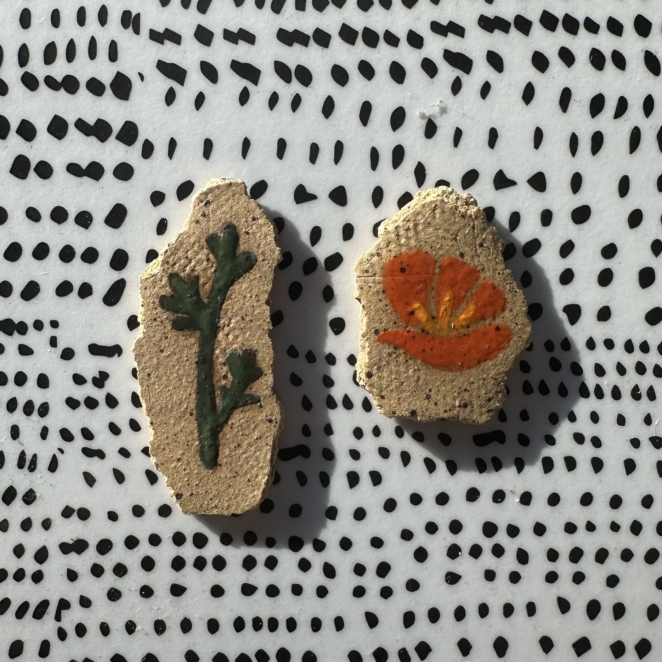 A quickie this week. I had some extra orange underglaze from the SFMOMA x GFE First Thursday ceramic poppy extravaganza, so I experimented with painting on my little earring nubbins.