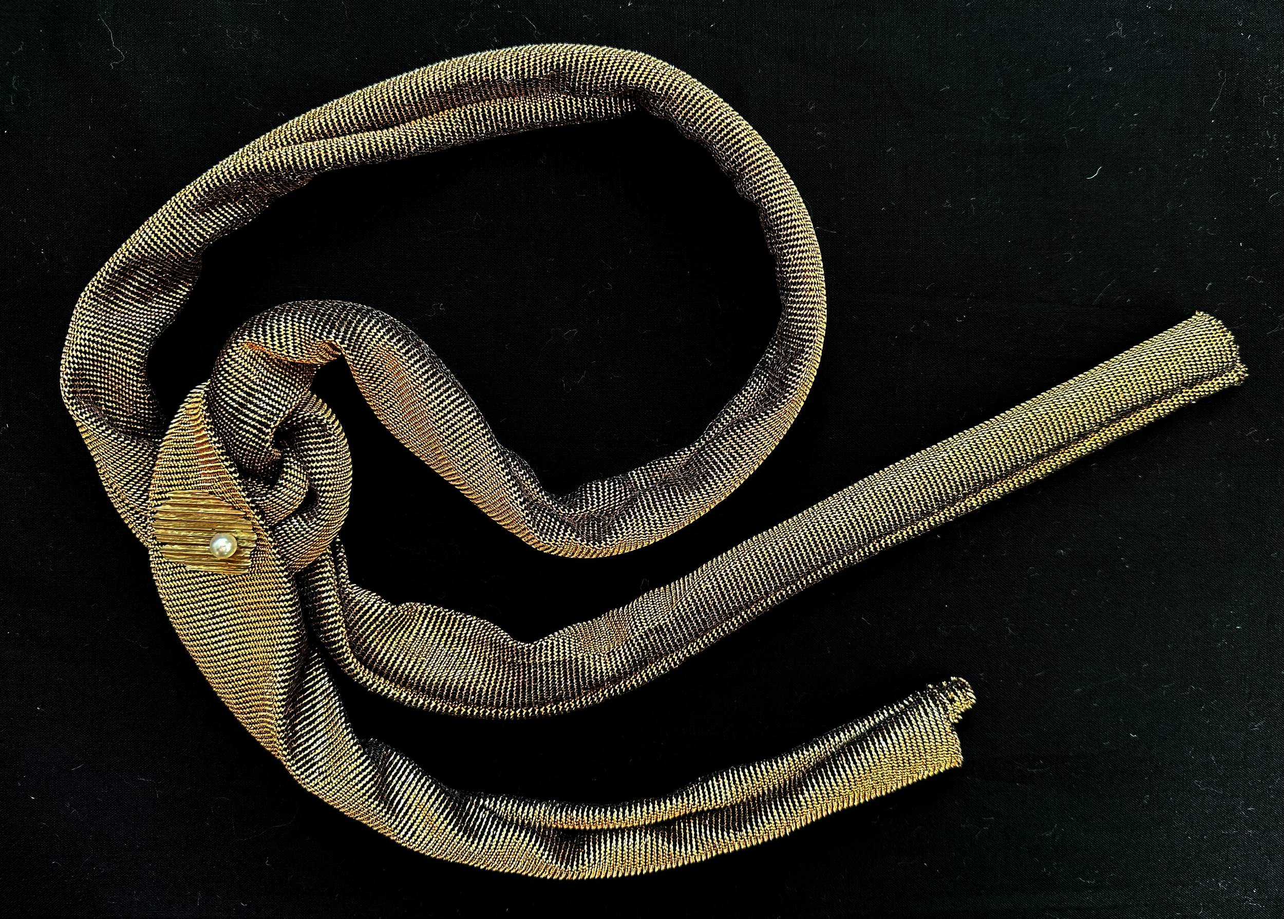 I have no idea what my grandma did with the rest of this very shiny fabric, but I’ve had this strip for a long time. It drapes so well, and I love how it looks with a jaunty tie and golden brooch (with pearl accent) that my grandpa made. Miss those two.