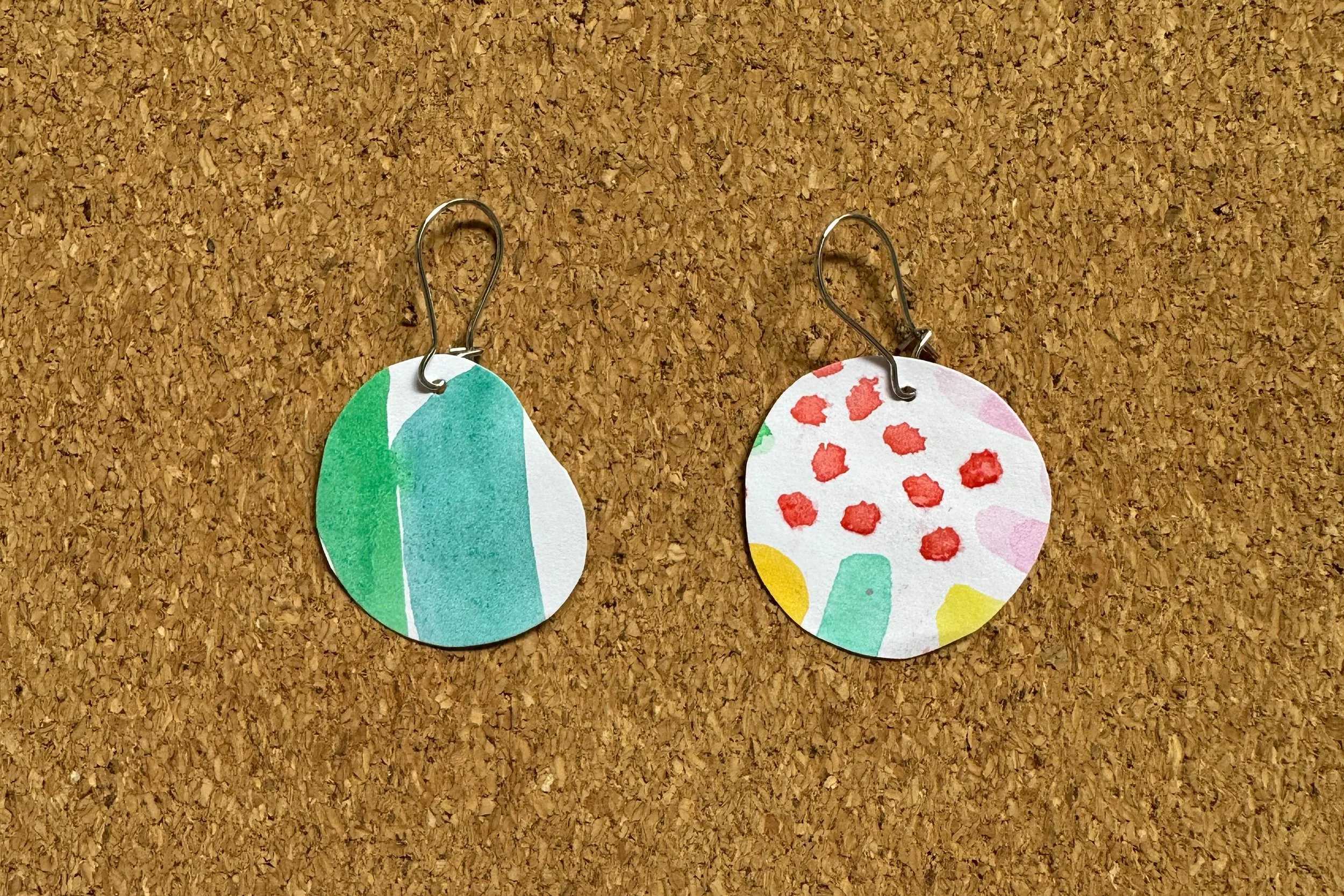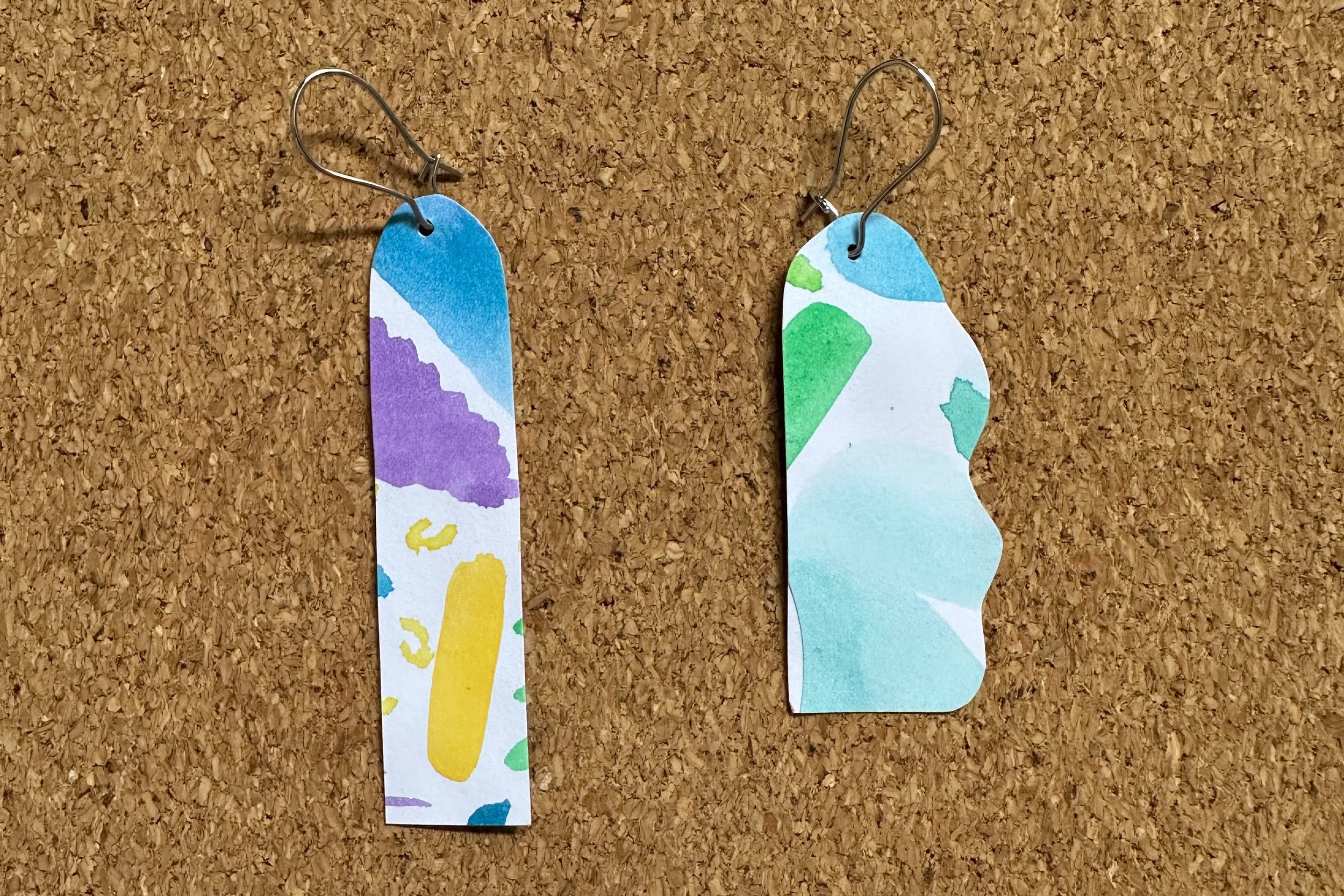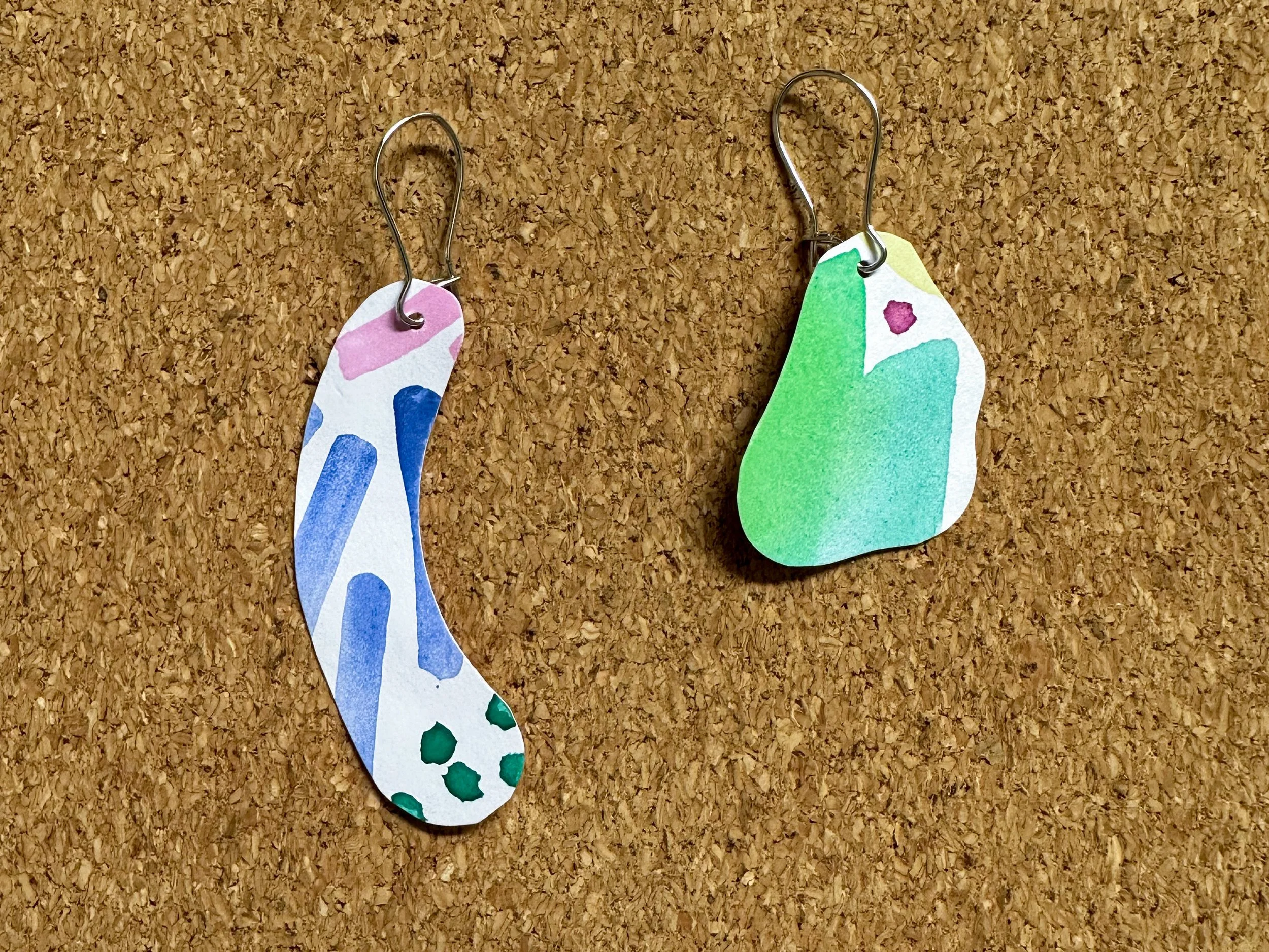 Tools and materials: watercolors, paintbrush, paper, scissors, gluestick, ear wires (kidney).
