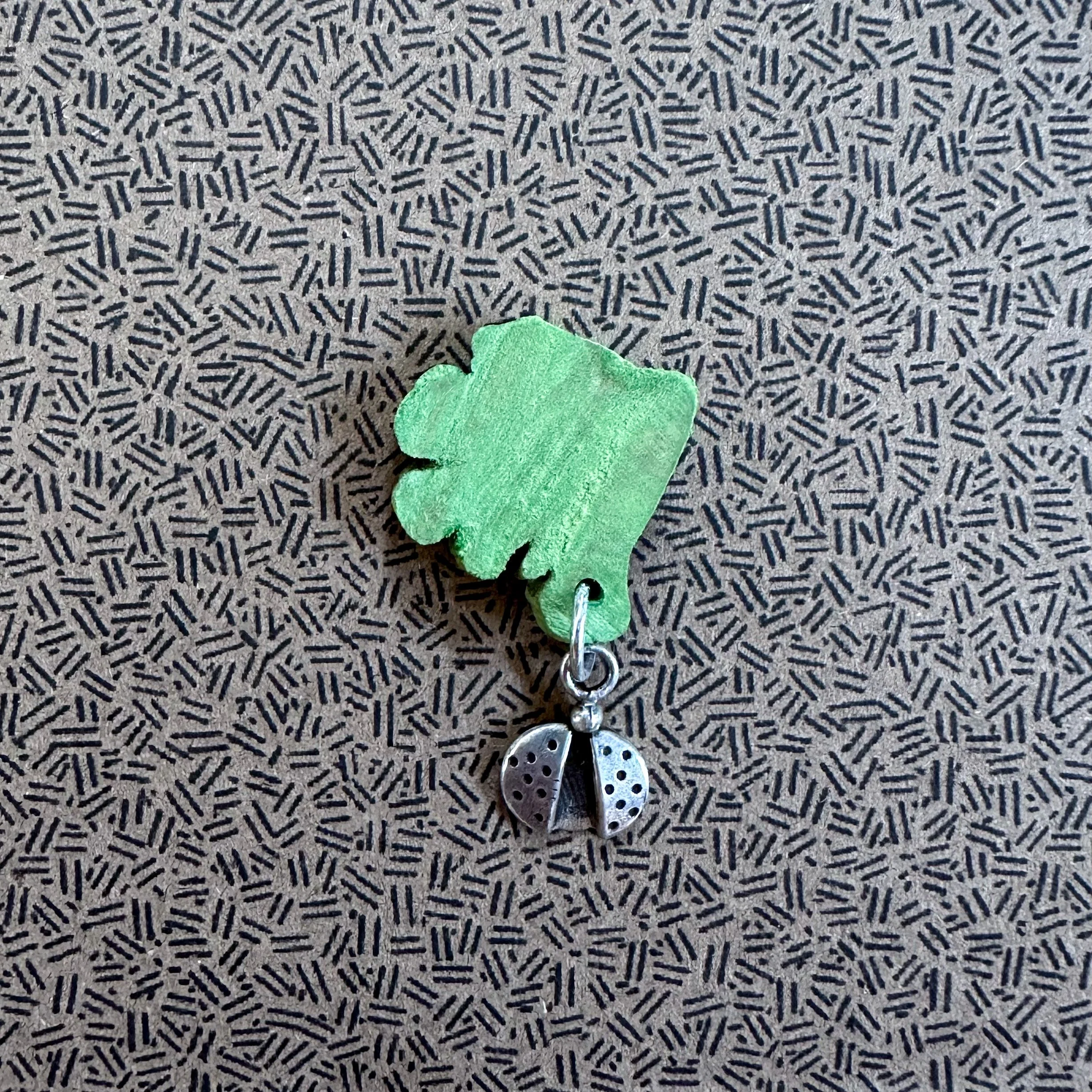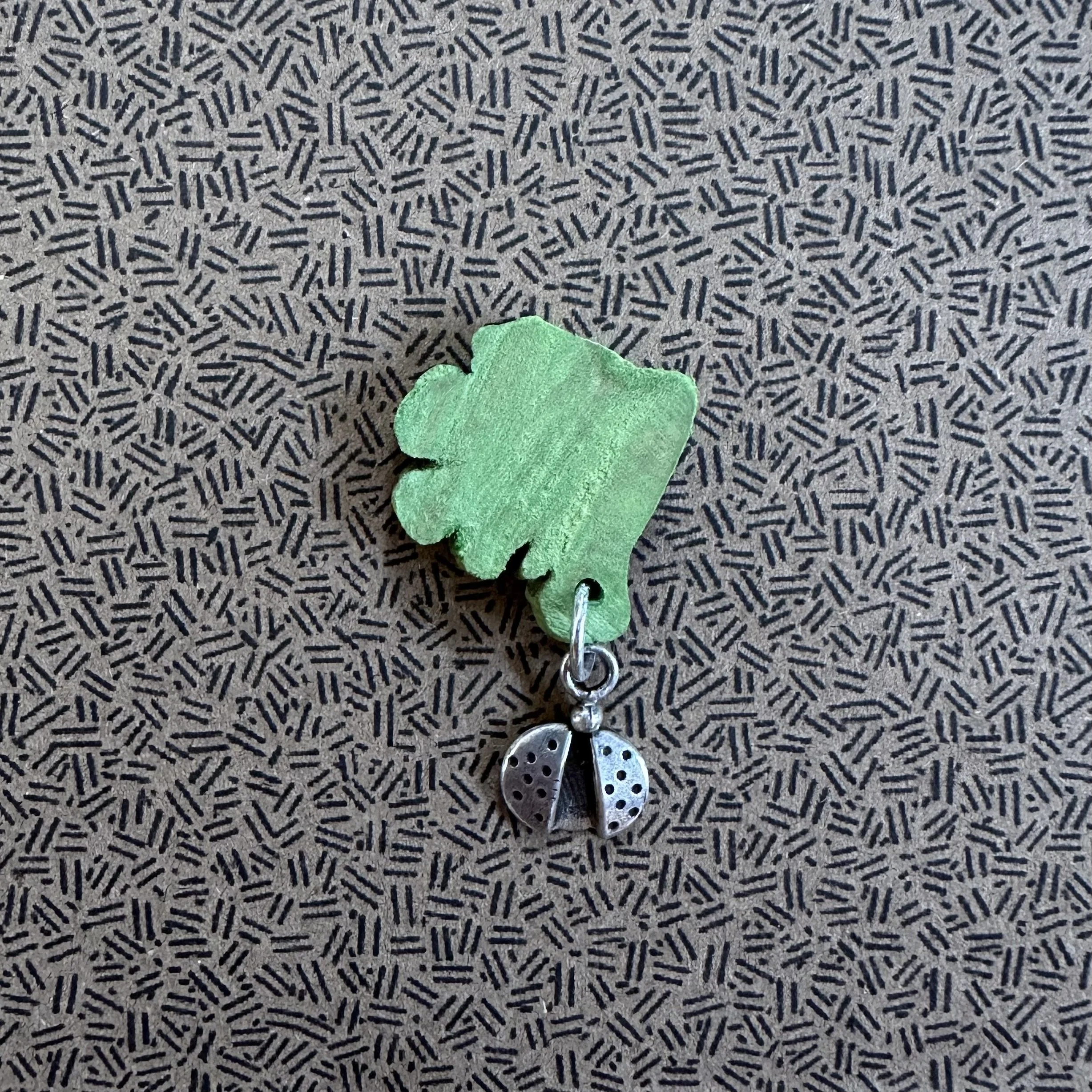 New collab — with my mom. She made this ladybug decades ago when she was a jewelry designer, and I put it together with a bit of a rosemary. The wood reminds me of a leaf chomped on by aphids, and then Ms. Beetle comes to the rescue.